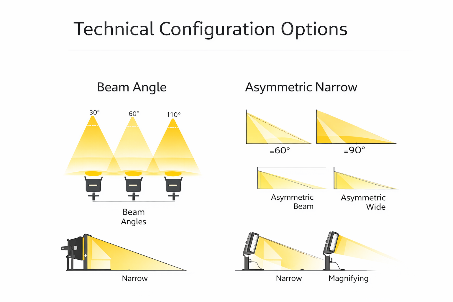 Multiple beam angles and asymmetric optics are available to optimize light distribution for facades, pathways, yards, or wide-area illumination.